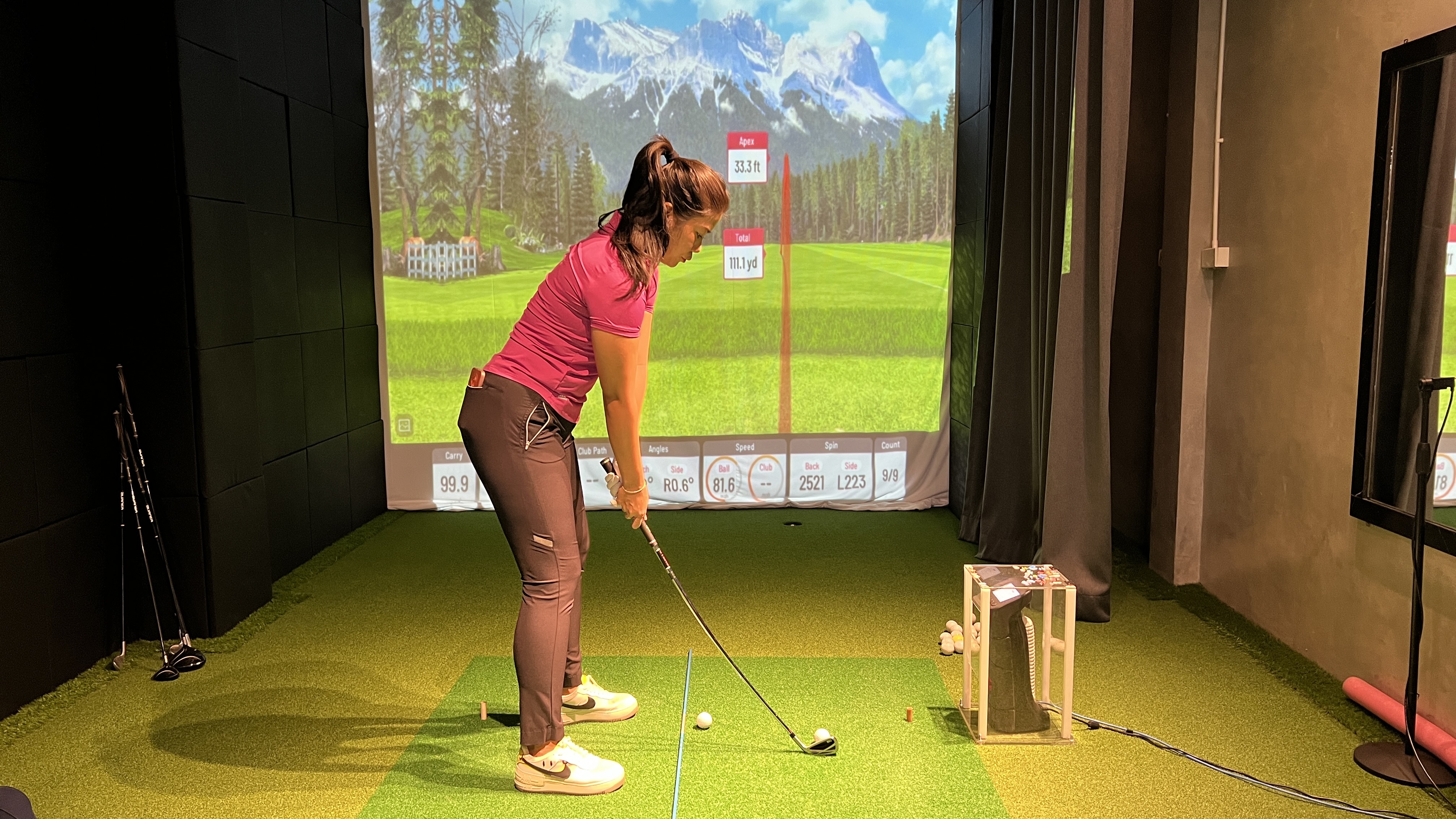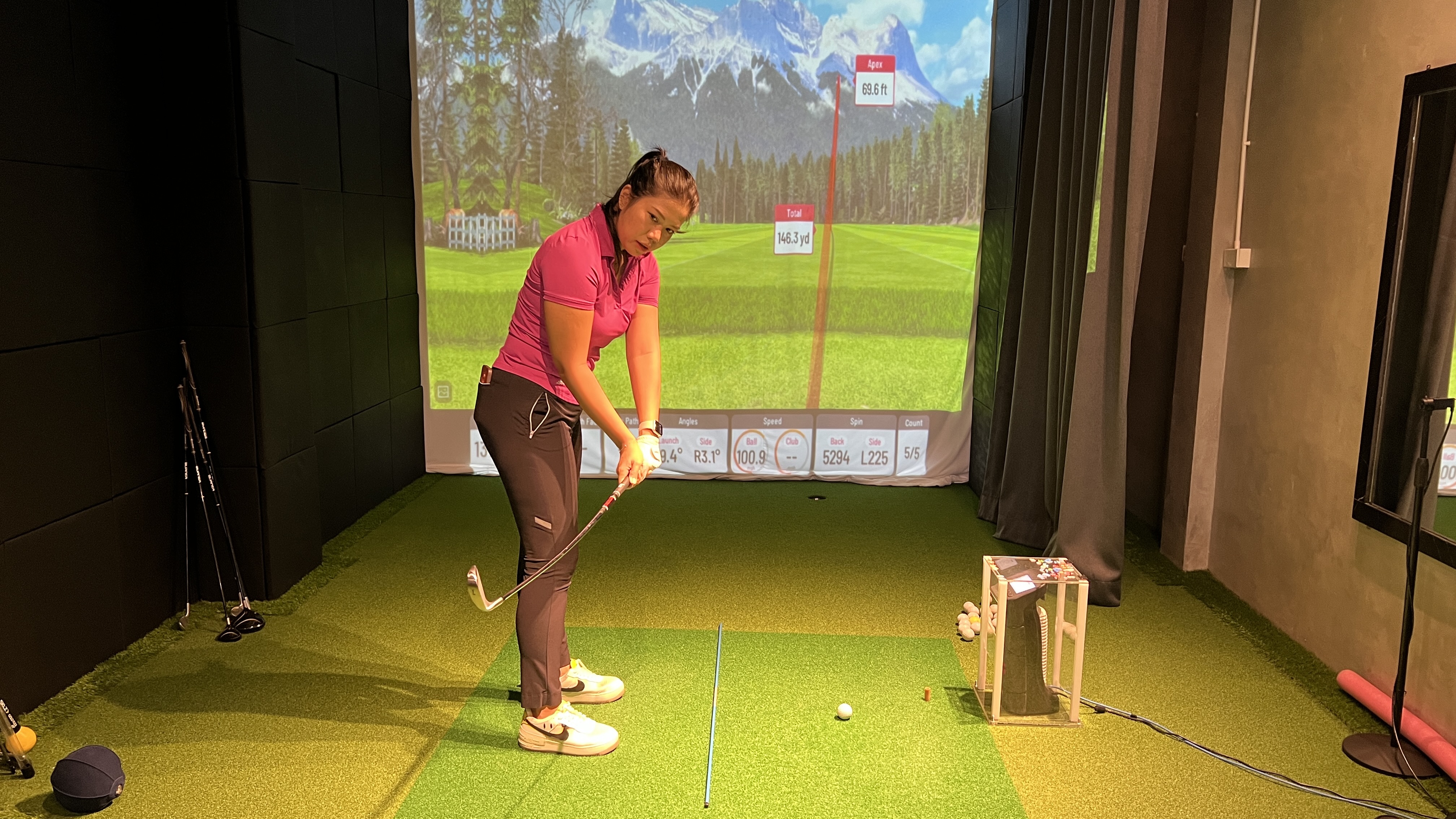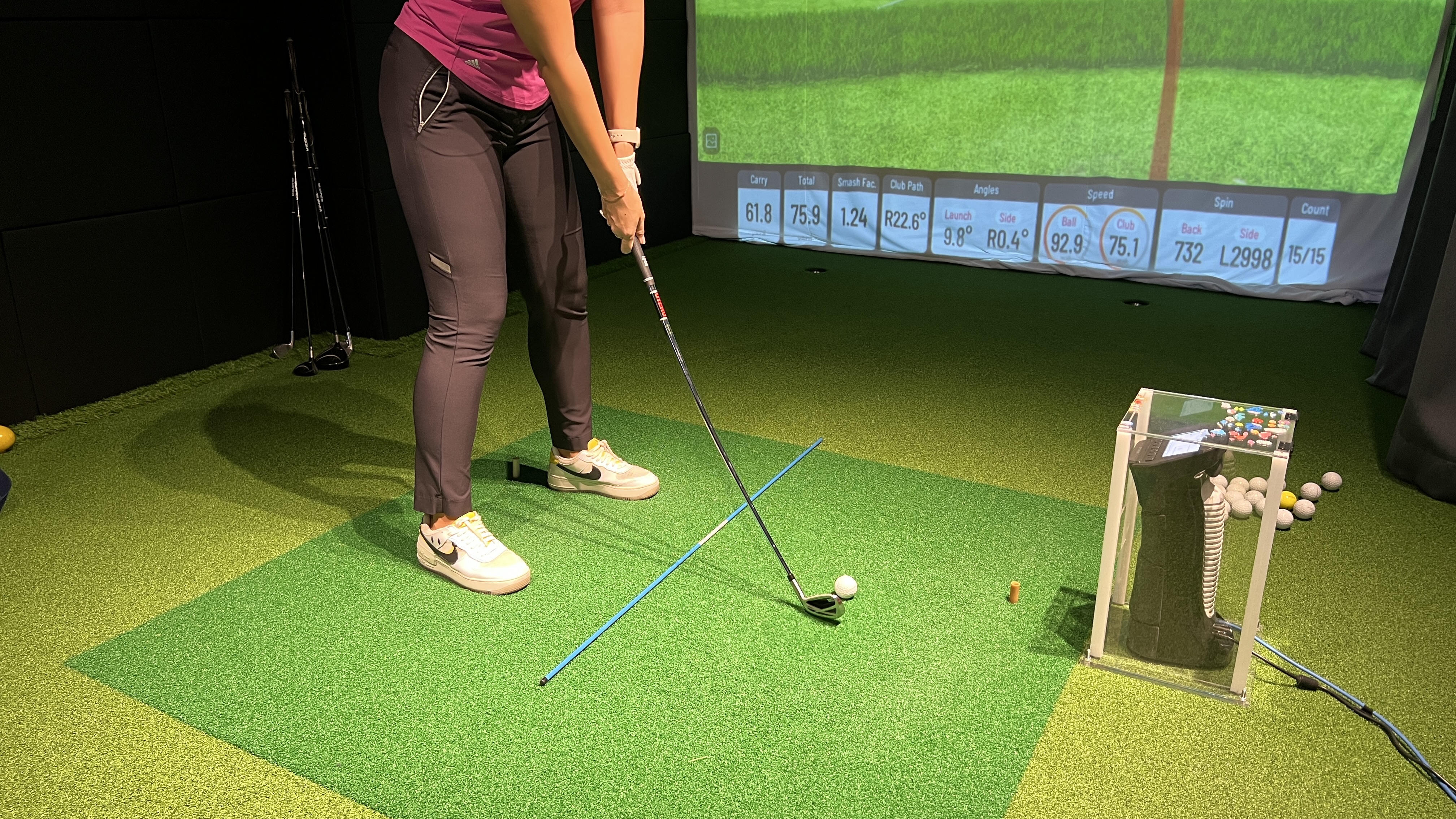 場所はエカマイの有名練習場ティーオフのすぐ横のソイを入ったところなのでアクセスはGood。エアコンが効いた部屋でドリンクサービスあり、シュミレーターあり、画像解析あり、と至れり尽くせりのレッスンを楽しめる。